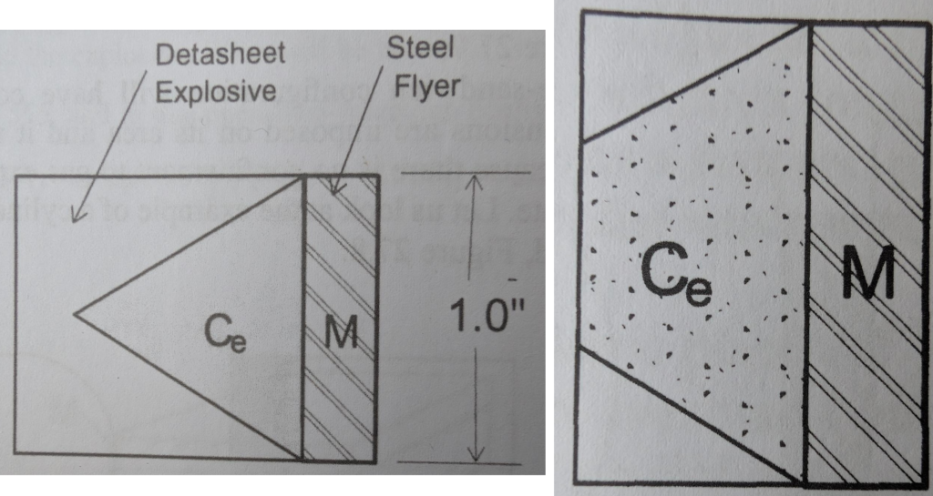 For an unconfined explosive, these gases escaping to the sides are doing no work on the target and hence they need to be discounted for a precise understanding of the effects. Fortunately the experiments have already been done and it turns out that that there is a “cone” of effective explosive mass of 60°. What this means is that the configuration of explosives make a big difference: stack too high or too wide and you may be wasting explosive. The figures below show two cases of unconfined explosive driving a flyer plate: